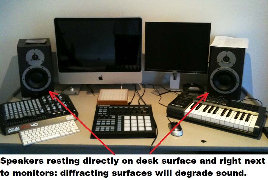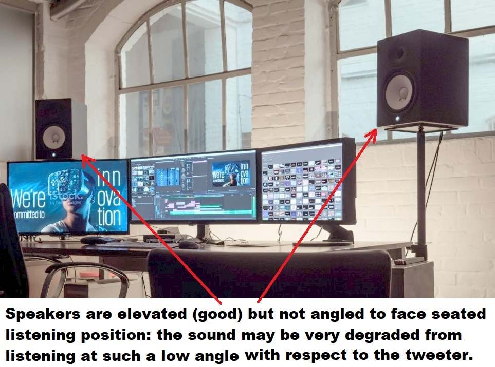One thing that can be done is that the speaker can be raised off the desktop surface by a desktop speaker stand or a riser of some type. The further you get the speaker away from the desktop surface, the better it will be for the acoustics. Two things that must be observed in raising the speaker off the desktop surface: the speaker shouldn’t be raised so high that it seems like the sound is coming from above rather than from the front, and the tweeter of the speaker should maintain an aim at the listener’s ear level. If you look at how many speakers are set up in recording studios, these are practices that are commonly seen: a raised speaker angled to face the recording engineer.