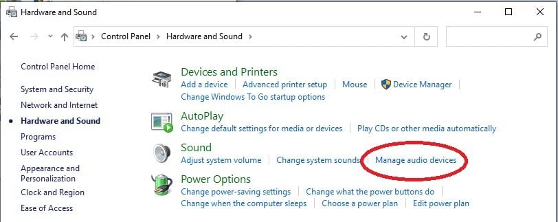 - In the ‘Sound” submenu on that panel, click on “Manage Audio Devices.” That will bring up another panel for sound controls titled “Sound.”