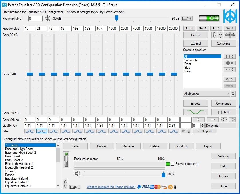 If you want to globally EQ all sound from your PC’s output, I have had luck with Equalizer APO combined with the Peace extension for a more intuitive interface for my Windows10 system. These do require you to enable audio enhancements in Windows. There are a lot of equalizers that do the same with different feature sets, different GUIs, and more or less flexibility, for both Apple and Windows OSs (here is a nicely comprehensive list of software equalizers that someone put together). Many do cost a small fee, but many are also free to use such as Equalizer APO with Peace.