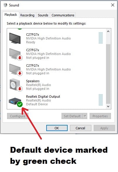 - Under the “Playback” tab in the Sound panel, look for your default playback device - it should be marked with a little green check.