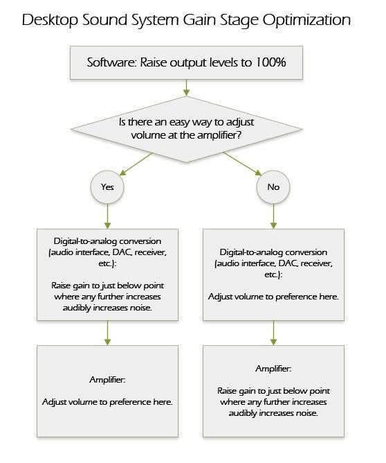 Another good place to adjust the gain is at the amplifier stage for the speakers. On powered speakers, the amplifiers will be built in the speakers, of course, and some powered speakers have a volume knob on the front baffle of the speakers. Many powered speakers have the volume knob mounted in the rear, however, and that makes it a bit cumbersome to adjust on the fly. For powered speakers without immediately accessible volume knobs, I would recommend the volume knob be set at a level just below where noise can be heard to audibly increase with higher volume knob settings and to just adjust the volume at the DAC or pre-amplifier stage. One thing that should be mentioned here is that many powered speakers have a noise floor that may be audible and which is not affected by volume knob changes. That noise floor should be ignored in setting up optimal gain levels in a signal chain since there is nothing that can be done to lower the noise floor of a powered speaker’s amp (aside from getting powered speakers with a lower noise floor). We can only address the amplifiable noise in gain stages, not the noise that is not affected by amplification.
