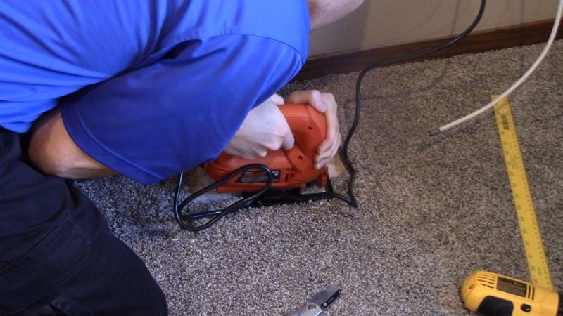If you’re dealing with carpet, use a utility knife to cut through the carpet and pad prior to using the drill or saw. This will help prevent the saw from tearing out strands of carpet.