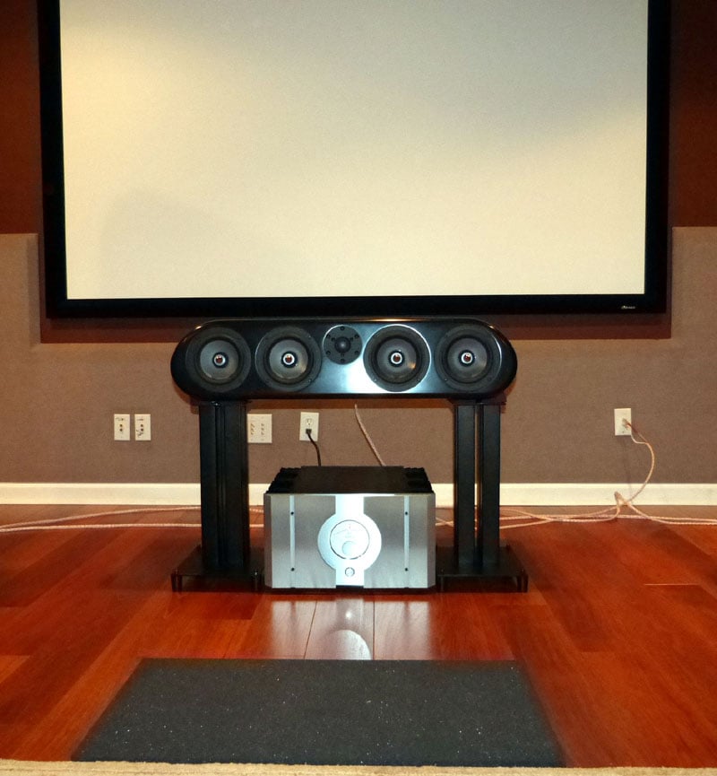 I initially plopped down the Status 8C center channel on my 20" Plateau stands while I focused on testing and reviewing the 8T tower speakers (as shown in the picture below). It sounded quite good positioned like this, but more so in the front row than the back row. My theater room as two rows of seating with the second row placed on top of a riser platform.