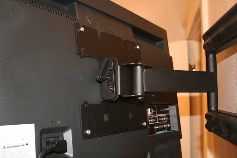 Guess what? You're almost done. If you planned the install correctly, all that's left is cable management. Go ahead and hang your TV on the mount's VESA-compatible mounting plate (assuming your mount was like ours, if not, follow the instructions that came with it). With this particular mount, you can place the top two screws (included) into the mounting holes on your flat panel, and simply set the TV into the mount - it will hold it while you put in the lower screws and tighten everything down - very simple. When you're done you should have complete control over the articulating mount, and be able to fully extend and retract the TV in addition to being able to set the tilt as needed. For cable management, just pop off the twin plastic covers on the top and bottom arms and run your cables along the arms, replacing the covers and snapping them into place. Very neat and very easy.
