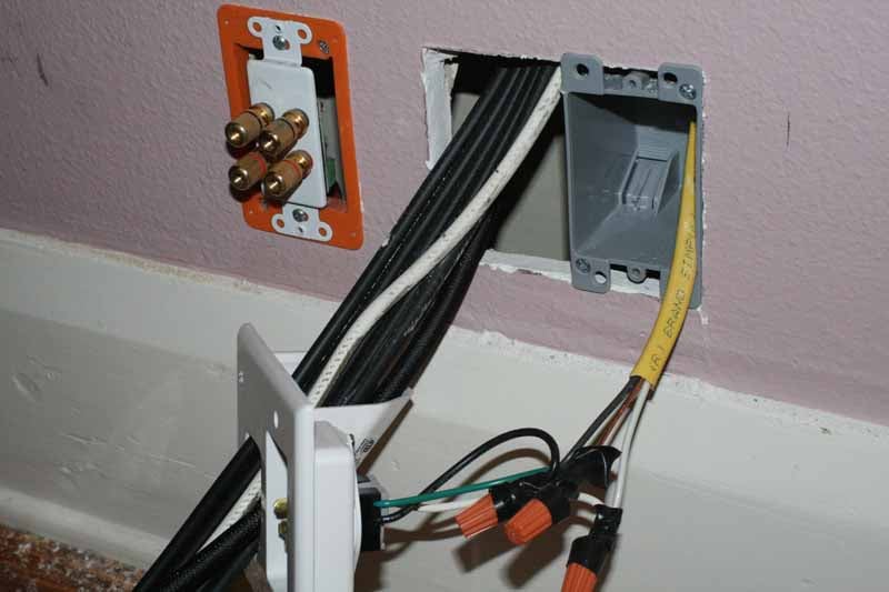 After cutting our holes, we ran the 12/2 power cable through the included remodel box and the low voltage HDMI and component video cables (as well as our RF cableTV line) through the remaining opening. The source end of the Recessed Pro Power Kit comes with cable leads, rather than screw-down termination connections, so you'll need to use the included wire nuts to make your final connections. As for the low voltage runs, don’t forget to pull the cables through the opening before you run them up (or down) the wall to or from the TV.