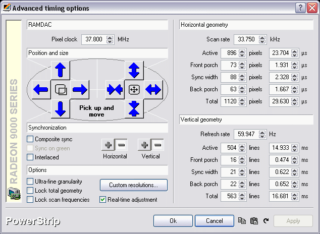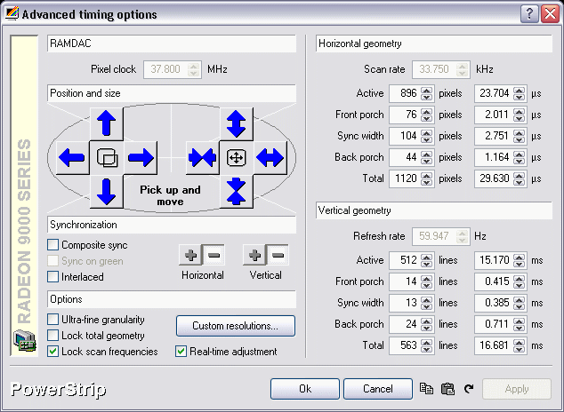 Tip: It is probably a very good idea to check the "Lock scan frequencies" checkbox at this point. This will keep your Horizontal scan rate locked at 33.750 kHz and your Vertical scan rate locked at 59.94kHz. See below...