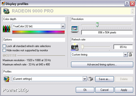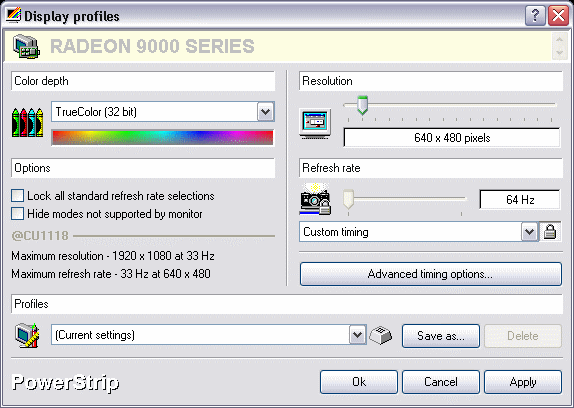 To use Powerstrip, you must have a video card that supports custom resolutions. Some of the cards that support custom resolutions are the ATI Radeon series, Matrox G-series, Parhelia, NVidia or 3dfx graphics cards. Some of the cards that do not support custom resolutions are the S3, SiS, Trident, Intel, ATI Rage and Rage128 cards.