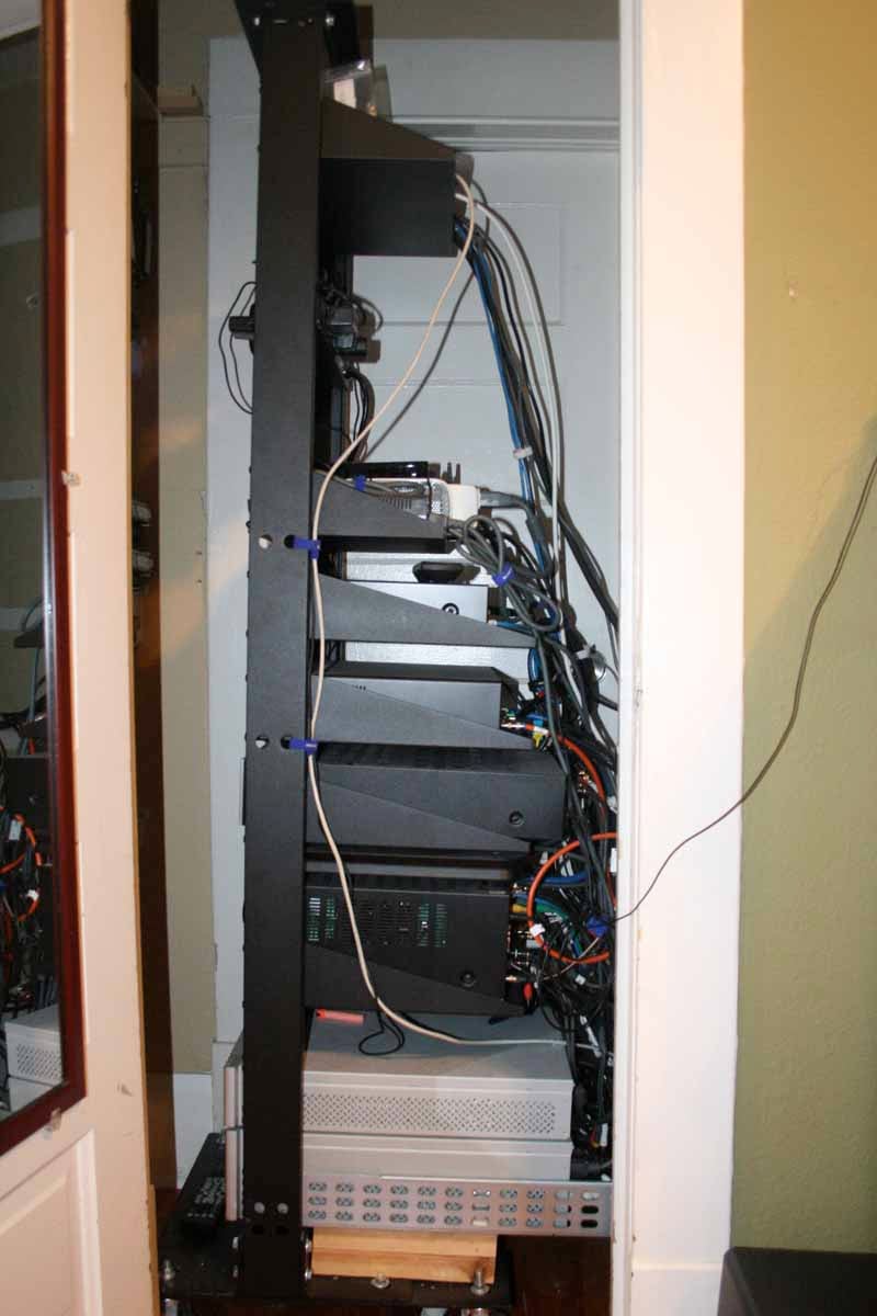 Now we also really customized our relay rack. We did this for a number of reasons. First, our location allowed for a rack much taller than the 4-ft relay rack MonoPrice also sells (#8619), but it wasn't tall enough to completely house the 7-foot tall version. The beauty of a relay rack is that it's very simply constructed. We just chopped it down and re-bolted the top to the shortened frame. Voila, our 7-foot relay rack was now a 6-foot tall rack. In addition, we didn't want to bolt the rack to the floor - which is the common method of mounting a relay rack. The compactness of the rack is what gives it its charm. Instead, we bolted it to an offset, castered dolly base that easily supported the weight of the rack and the components we placed into it. In this way we were able to wheel the rack in and out of our closet, giving us access to both the front and rear connections of our equipment.