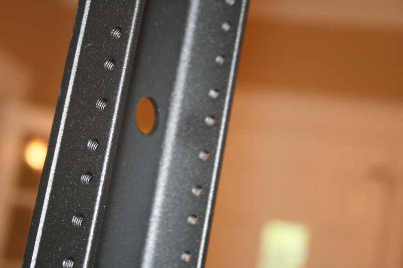 Assembly of the rack was pretty basic. MonoPrice sends it in a long, rectangular box. It makes sense since this is a relay rack - and that means it's essentially two robust double-sided rack rails, a top, and a base. All of the shelves mount to the rails and the entire unit lacks any sort of enclosure or rear support rail. The 7' Relay Rack is really heavy duty and is constructed out of 6061 T6 Extruded Aluminum. It's not going to rust and it isn't going to bend or break. It's tough. The rack rails support 12-24 screws and have tapped holes on both the front and rear flanges (standard EIA spacing). The rack, when assembled facilitates the mounting of standard 19 inch EIA rack mount-compatible shelves of components. It also comes with a black powder coat. Its design is open and allows a tremendous amount of airflow - more so than what you'd get with any entertainment center or vented equipment rack.