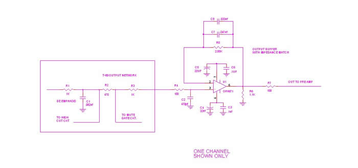 The following schematic is of the T-80 output circuit and the buffer installed to lower the output impedance so I can drive a Jensen Audio Isolator, which is just a pair of Jensen line level transformers in a package.