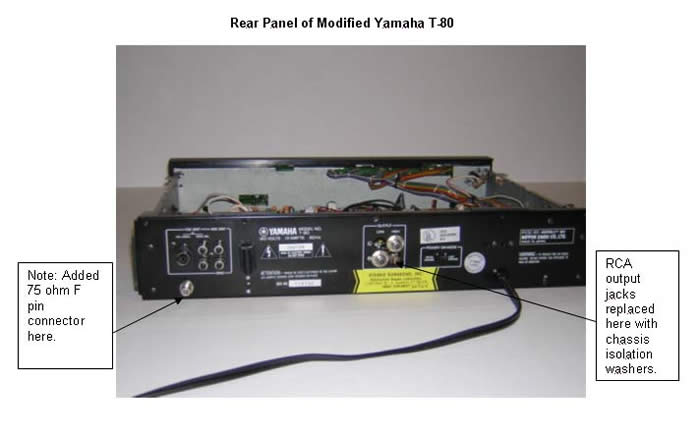 As I previously noted in this article the board layout is single sided and ground plane in the unit has been sacrificed to accommodate a single sided board. The main ground to the chassis appears to be a chassis support bracket that goes down between the RF section & the rest of the unit. I added ground straps using 1/8 inch flat braid from the return of the power supply to the chassis. From the return of the power supply I added a ground strap that went to small ground plane near the audio output. From there a ground strap was connected to a small ground plane of the IF section. From that same ground plane in the audio output section I added another ground strap to ground plane next to the bracket. The very last thing was to install a 75 ohm F pin connector for the RG6 cable run from the antenna. When the Yamaha T-80 was produced Yamaha used their own custom 75 ohm connector and these parts are no longer available. Note from the photo the short lead length down to the P.C. Board.