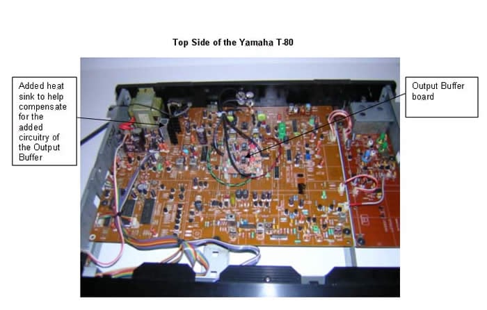 Most FM tuners from this era suffer from two major problems. They have a high and reactive output impedance, and the grounding scheme inside the unit is at best dubious. This is a unit from the era when single sided boards where standard issue. The near total lack of ground plane and high impedance returns to the power supply are very much part of this unit. One wonders what the performance might have been had Yamaha decided to use a double sided board with a fair amount of ground plane on the component side of the board. The following will show an approach to tackle both of these problems.