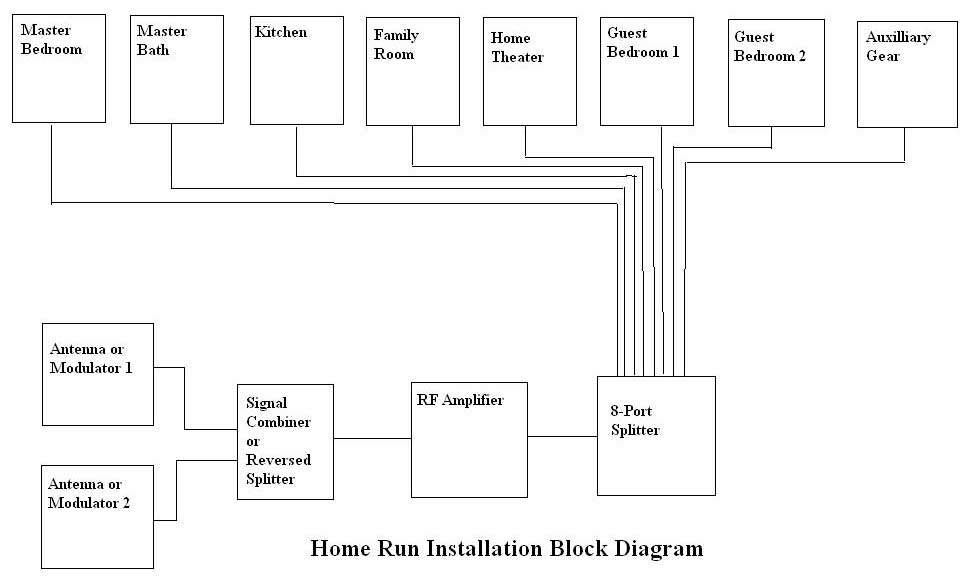 A home-run system is exactly what it sounds like. Each coaxial cable runs directly from the antenna port in the remote location home to the master distribution location where it is connected to a multi-port distribution block. This configuration is sometimes known as a “star topology.” The advantage of this layout is an easy opportunity to control interference from port-to-port, easy solutions for ground-loop interference, and ease of balancing delivered signal power. Additionally a home-run system simplifies equipment selection as field measurements are predictable and system performance often mimics theoretical expectations to a great degree. The disadvantage is that you’ll end up running a lot of coaxial cable and you’ll have to deal with a large bundle of cables at the demarcation location.