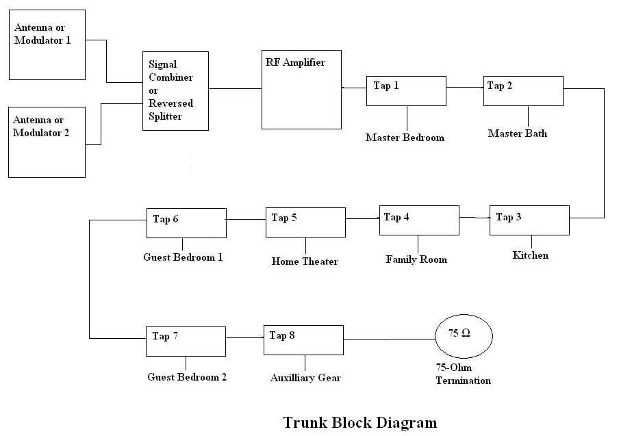 A trunk-based system uses a single master “trunk” line to distribute the signal. Each drop is then set off a tap. The number of taps must be carefully analyzed to provide balanced signal levels at each drop location and the entire system must be properly terminated to maintain 75-ohm characteristic impedance. A trunk system’s greatest advantage is the ability to cover lots of space with a minimal amount of wire. A single line can be run several hundred feet and feed dozens of drops. The disadvantage is that every device connected to the trunk can affect every other device, so careful planning and equipment choice is critical.