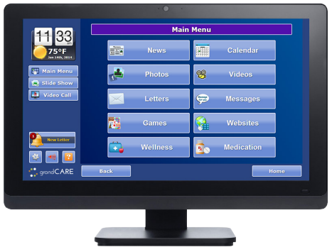 Going back to the clutter home bound room, let’s drift our focus to the armoire or desk area where the supplemental equipment is found. Harper Technology Group and GrandCare Systems bring to the market the most comprehensive and feature packed system available in the world today. This system combines aspects of home automation technology, activities of daily living assessment, secure internet communications, health monitoring, family and friend socialization and awareness, cognitive stimulation and even energy control, in one flexible, affordable system. Their product line of Home Health Tech is not only used at Assisted Living facilities and Retirement Homes but they are also used at the consumer’s homes too. Their motto is to allow a higher opportunity of independent living with home automation and social engagement. What makes this happen? A wonderful touch screen is placed at customer’s home. It allows for a full access to news, weather, email reminders and more, even playing games, music and many other activities that help to improve their cognitive minds. Every day stimulation is a big thing in this type of patient care, even if is just to keep your mind sane while homebound or alone.