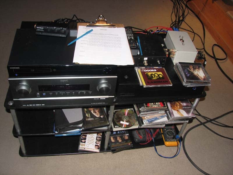 amplifier, a Panasonic Blu-ray player and an Axiom made switch box. The switch box had a series of potentiometers