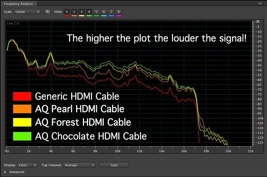 Let's start with a summary of events. Mark Waldrep, aka Dr. AIX, is the company founder and Chief Engineer of AIX Records and one of the leading advocates for true HD-Audio. He recently came across a YouTube video, hosted by Home Entertainment by D-Tronics and featuring AudioQuest Regional Sales Manager David Ellington, which purported to show the audible difference of replacing a generic HDMI cable with AudioQuest Pearl, Forest, and Chocolate HDMI cables by playing a sound clip recorded through each cable. Mark measured the sound clips from the YouTube video, which you can see in his blog post.