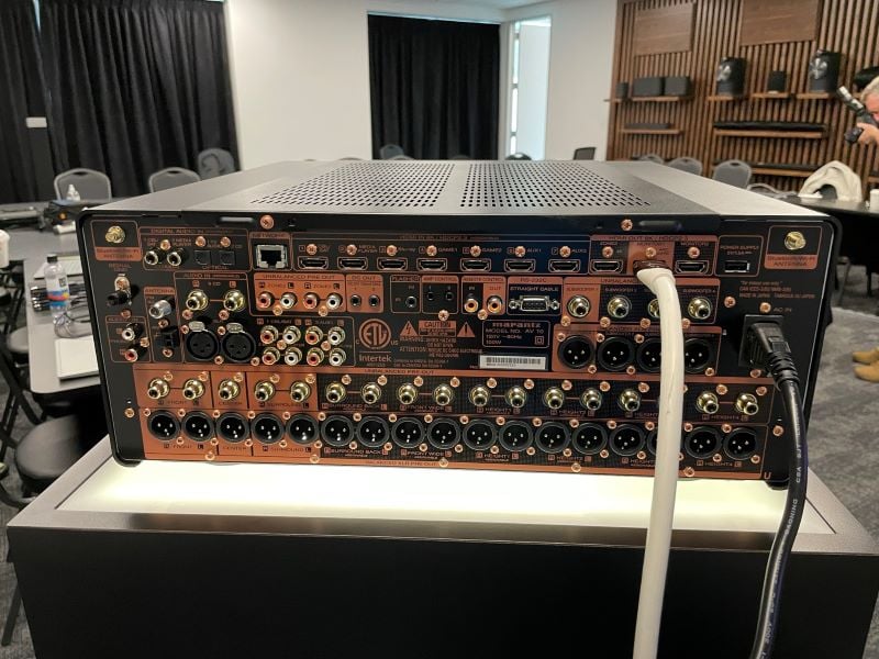 Gary Dayton of Marantz walked us through a thorough analysis with the AMP 10 and AV 10. These components are priced at $7,000 each which is a significant step up from the AV8805A. Marantz confirmed the AV8805A is staying in the lineup to provide options. Some notable differences at 15.4 channels instead of 13.2; seven-8k HDMI inputs instead of one; optional Dirac Live; speaker presets, better bass management, and better measurements. The AV 10 has all the functionality of the AVR-A1H discussed above, but with some extra attention paid to maximizing sound quality (and of course no amplification). There are multiple power supplies in the triple layer and divided chassis to maximize performance and reduce noise levels. Both the AV 10 and AMP 10 share the new Marantz industrial design with center front panels made from aluminum, a small porthole display and curved, textured polymer front side panels, which can be illuminated by the built in panel light. Marantz’s newest HDAM SA3 purely discrete analog output circuits are utilized which help provide the warm sound Marantz is known for. While there are balanced connections, the interior topology is not fully balanced, but other steps are taken to increase audio performance. As with the Denon, there are multiple, stereo DACs. Interestingly, in order to further reduce potential cross-talk, the pairings are not simple left and right but rather two channels are not likely to have similar information at the same time, such as front left and right, rear height channel. Design choices like this were pointed out as the various parts of the processor were passed around. A small, but nice touch is the new remote, which is more substantial than the AV8805A remote and feels more like a hi-fi product remote than a receiver remote. While this means no screen or expanded functionality, I find myself using the Marantz app to control my AV8805 when doing anything more than switching inputs or changing volume.