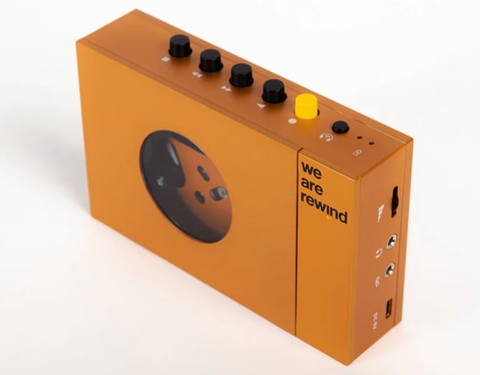 Marrying a sleek, simplistic design with state-of-the-art audio engineering, We are Rewind delivers the reinvented cassette player encased in aluminum with that familiar warm, high-quality analog sound. Just like old-school cassette players, We are Rewind players have fast forward/rewind buttons, a headphone output, a volume control, and an audio input so users can create their own mixtape.