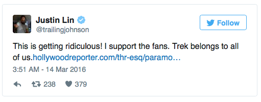 CBS/Paramount responded again with details of their complaint against Axanar Productions in a 48-page document that outlined in painful but sometimes humorous detail all the things that Axanar infringed upon. That’s when Star Trek Beyond director Justin Lin tweeted his support for Axanar and contempt for what Paramount is doing. But not all celebrity comments were so kind.