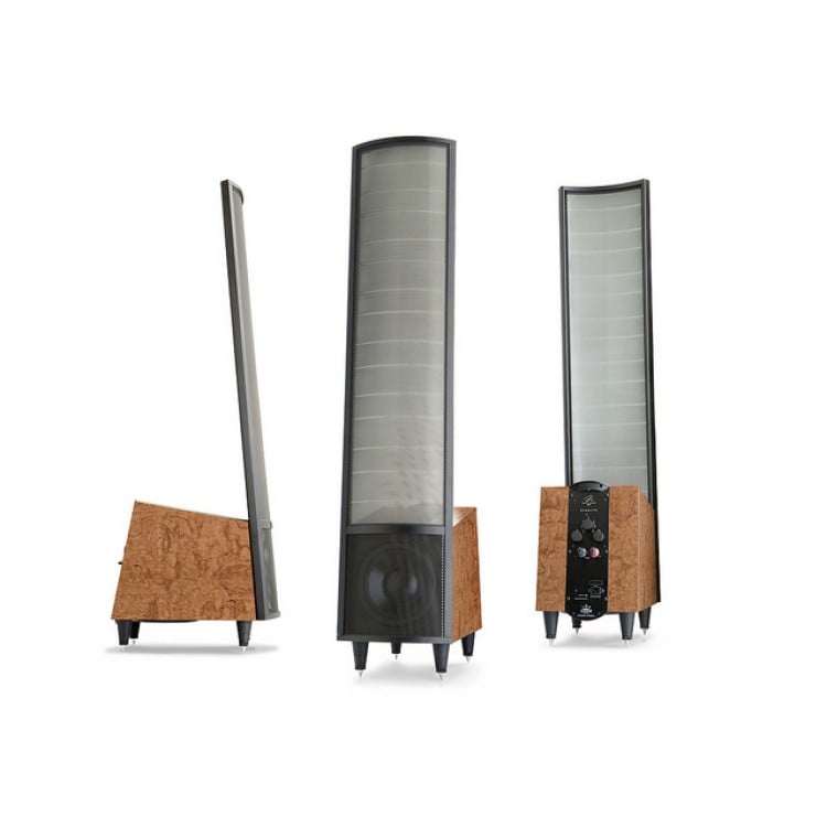 with brushed aluminum MartinLogan Summit speakers, along with a matching center