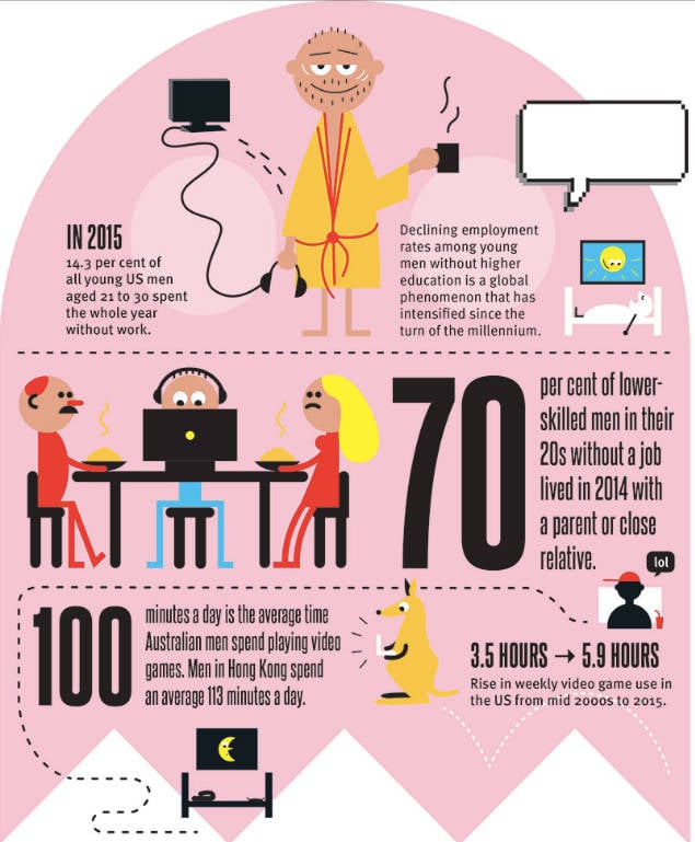 “Analysis of data from the US Bureau of Statistics’ American Time Use Survey found that, on average, men in their 20s without a Bachelor’s degree increased their leisure time by about 4 hours per week between the early 2000s and 2015. They gained this extra time through loss of work. Of that additional 4 hours of leisure each week, 2.5 hours were spent playing video games. On average, video game use rose from 3.5 hours per week in the mid-2000s to 5.9 hours per week by 2015. A quarter of young unemployed men reported playing at least three hours per day; 10 per cent played for six hours daily.”