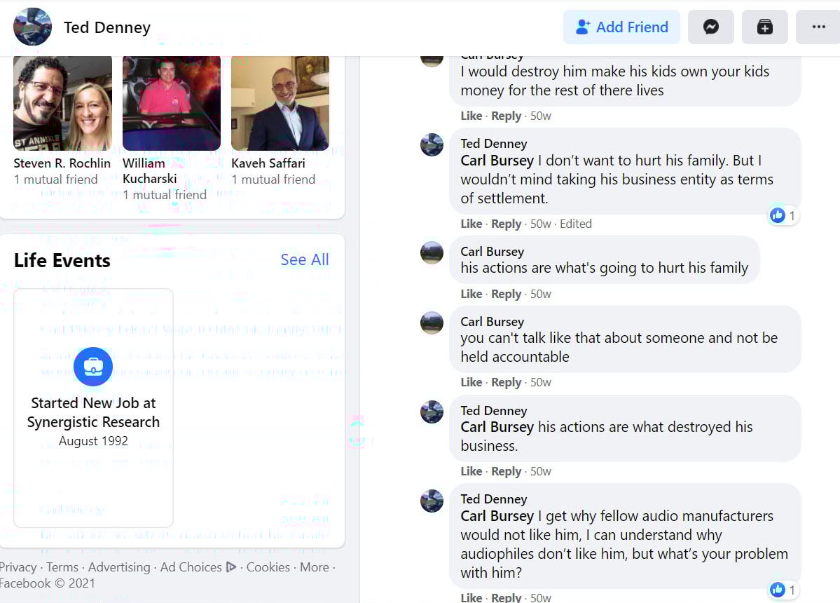 It appears Ted Denney is still at it with the threats and harassment towards the Audioholics community and me personally. A fictitious Facebook account under the alias Don Drapper was used to post disparaging comments on the AH Facebook page where he stated he and at least 10 of his supporters have filled fraud claims against me personally to the IRS over our GoFundMe. In addition, he has gone to various Facebook Groups like Audiophiles on a Budget to brag about reporting my GoFundMe to the IRS. He then deleted his posts and only retained my replies to make himself out to be the victim on his personal Facebook page. I had to make my personal Facebook account private because he was taking family photos of myself and a cropped image of my 13yo daughter in bathing suits to mock me on his Facebook page to his friends. I also learned today that the numerous daily phone messages using CallerID spoofing I've been getting to the AH Business line either containing dead space for 5 minutes or random sound effects are likely his doing since Ethan Winer of RealTraps has been a recipient of similar behavior from Ted. I posted this in the Audiophile Facebook Group and continuing to monitor how this progresses to determine the next course of action.