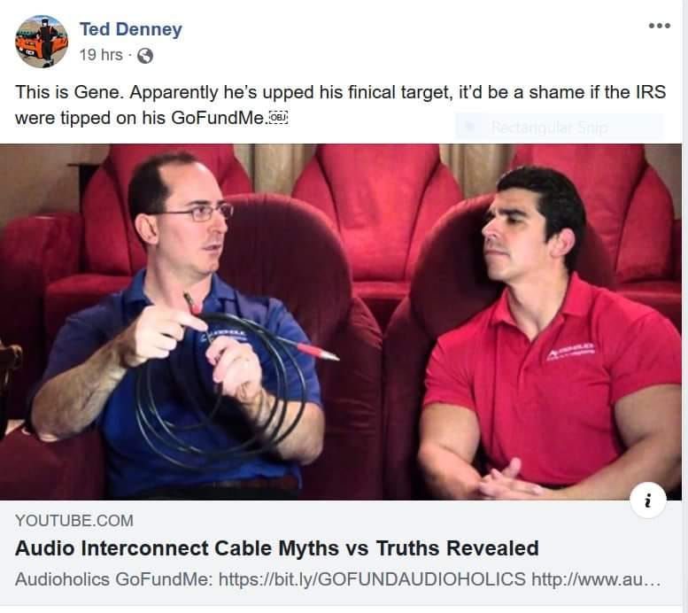 Ted Denney didn't stop there. He went on his personal facebook page and continued to disparage me and the Audioholics website, threatening to report our GoFundMe to the IRS.