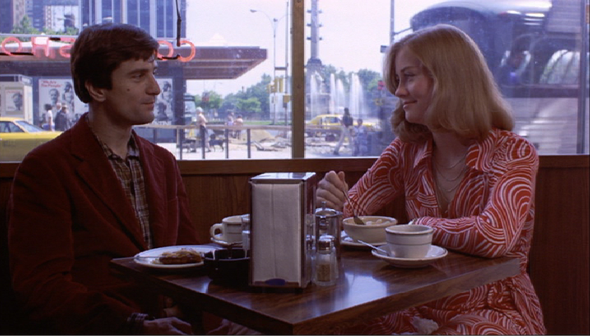 By contrast, daylight scenes are bright and magnificent - it almost looks like a different movie. Travis himself reflects this contrast - it's murky night scenes where, driving his cab, he wallows in angst and self-doubt. But it's a bright, sunny afternoon when he gets up the nerve to walk into the offices of the Charles Palantine campaign and ask the lovely blonde Betsey (Cybil Shepherd) out for a coffee and some pie.