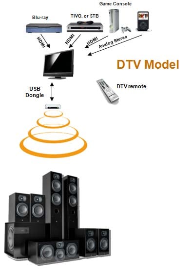 A new technology has arrived on the scene called Summit Wireless, an audio integrated circuit, which is being embedded in televisions, speakers, audio/video receivers, gaming devices, Blu-ray players, and set-top boxes, enabling them to broadcast high-definition surround sound wirelessly. Summit was designed with the DTV application in mind and offers a standardized API that TV manufacturers can easily integrate into their Linux environment. What is remarkable about the Summit system is that it is self-contained; only a few commands are needed by the master embedded inside the TV to manage the audio network. A USB 2.0 dongle option is also available to allow DTV manufacturers and other Linux based A/V equipment to claim Summit wireless compatibility now, without adding additional hardware costs to the TV platform. The appeal for the mass market is the "fast set-up methodology" listed below: