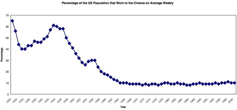 By the 1960s, long-gone were the days you could stop and chat with the gentleman in a porkpie or fedora, assured that there was a better than average chance he had seen the week’s newsreel at the local picture palace. By 1964 the percentage of Americans who made a weekly trek to a movie theater had fallen to just below 10%, but this number held steady through to the early 2000s.
