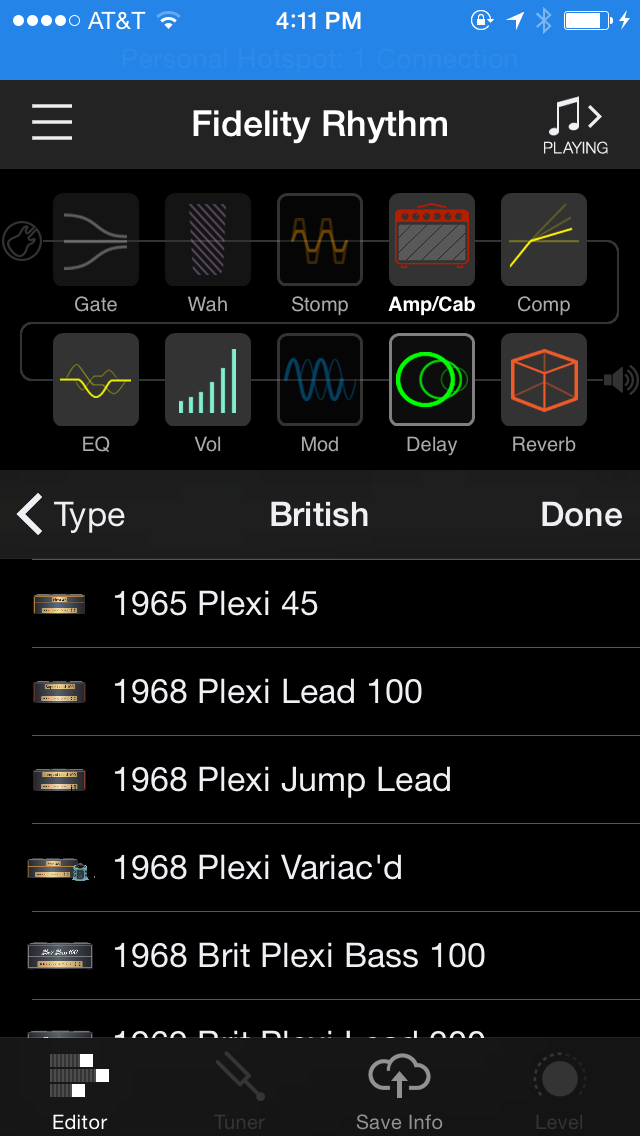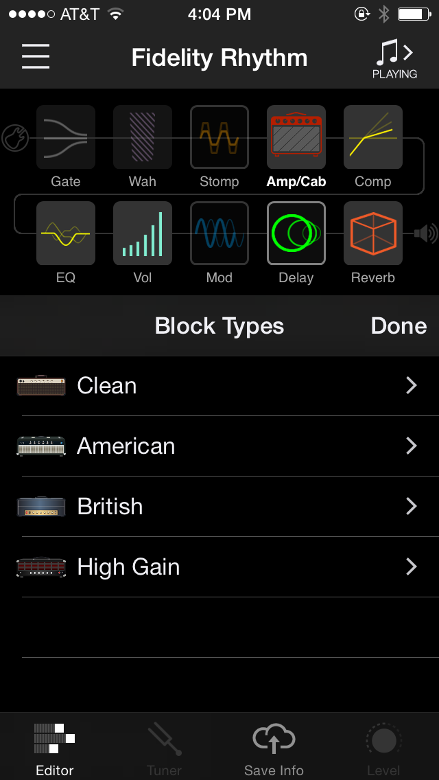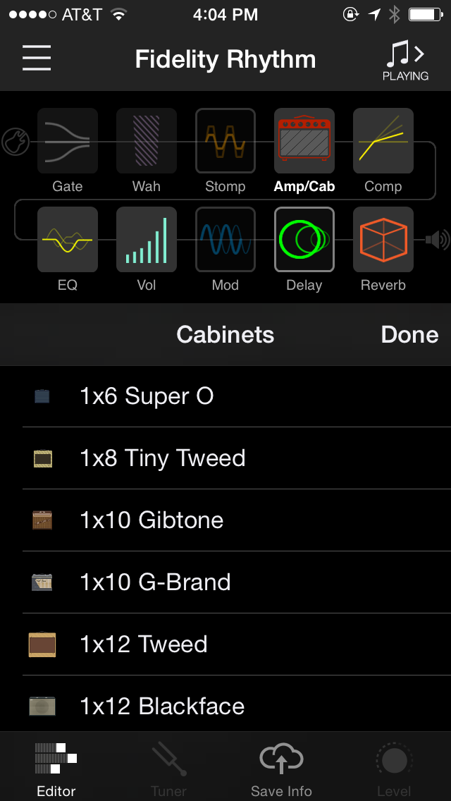 In its most simple form, a musician can plug a guitar into the front panel along with a pair of headphones, and operate the AMPLIFi TT with nothing more than the onboard knobs and buttons. But with a simple and free download, you can have access to what really makes this pre-amp a trend setter. Line 6 has developed an app that is compatible with IOS and Android, which in my opinion has revolutionized the way a musician can configure guitar tones. Without any prior training, I watched one brief but helpful video, downloaded the AMPLIFi Remote app onto my iPhone 5 and was able to intuitively weave through the amazing armament of features. I was unsure how the app would work on a phone, considering most of Line 6’s marketing photos show a tablet with a much larger screen. But I felt no disadvantage with the small screen size of the phone. Easy-to-read and identify icons made it easy to quickly select any of the features available with a simple touch. Amplifier models were categorized into Clean, American, British and High Gain. Cabinets were identified by the speaker size, number of speakers, and type of speaker/cabinet.
