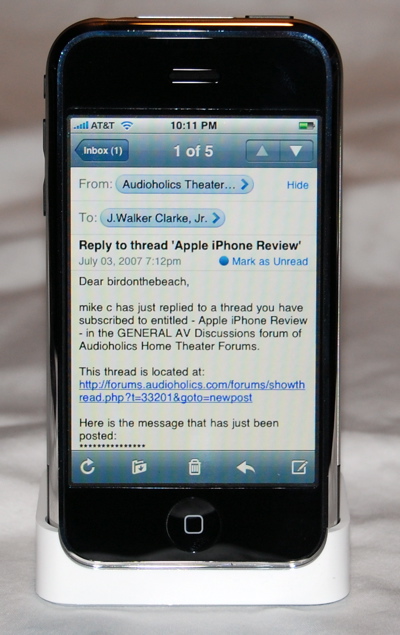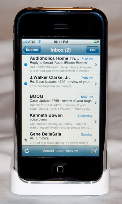 So that was the other shoe dropping. I had a friend in Nashville who had been waiting all day for his activation, and he was not happy. He had stood in line on Friday night, scored his phone, and then had returned home only to be told his phone would be activated within 24 hours. I guess Apple had controlled everything except AT&T's servers and their ability to handle the tens of thousands of activations happening all at once over the weekend. I read this morning a report from AT&T claiming only 2% of customers experienced delayed activation, but I have to doubt that. I read too many reports on online forums of this happening to people. I went to bed Saturday night happy to have an iPhone sitting in a cradle capable of doing absolutely nothing. There were no features that were accessible before completing the activation process, which kind of stinks when you have just dropped $600 clams on a piece of gear.