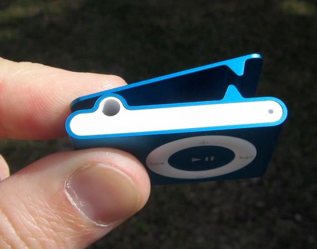 The front of the shuffle has a familiar round multi-switch, which is extremely thumb-friendly. The ring has volume up (top) and down (down), and skip or fast forward (right) and back or rewind (left). The center is the play/pause button.