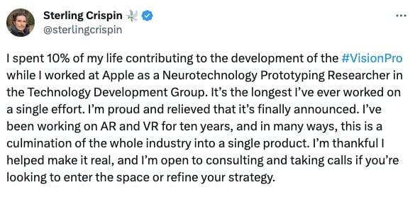 Former Apple software developer Stirling Crispin says he performed much of Vision Pro’s foundational work as a Neurotechnology Prototyping Reseacher. According to Crispin, while he was working on the project, Apple had been exploring “mind reading."