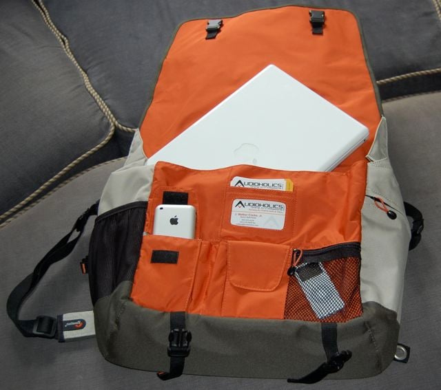 The front pocket is also zippered all the way to the bottom of the pack, again allowing for easy loading. On the rear wall of this compartment is a plastic hook for your keys, and a zippered pocket that is wide enough, but not quite tall enough to handle a standard sized magazine. Under that is another pocket (that will handle a magazine, since it is not zippered), and below that are a few pen slots and smaller pockets, including two mesh pockets. Again, this area has plenty of room for filling up with any kind of "stuff" you might throw in there. There is also a zippered compartment on the front of the bag for an iPod, and it has a water-resistent grommet for your headphones and the interior is lined with super-soft microfiber.