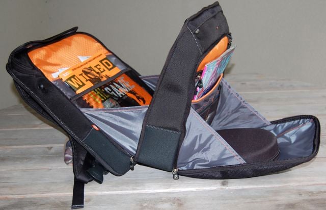 The main zippered center compartment has dual zippers that unzip all the way to the bottom of the pack, which allows you to completely open it up and spread it out, which is great when packing for a big trip. Fully unzipped and opened up, this thing is cavernous! Inside you will find a large rear pocket for magazines and documents, with a smaller mesh half-pocket on the front of it. On the front wall of the compartment are 3 more nylon pockets with flaps that have velcro to keep them closed.