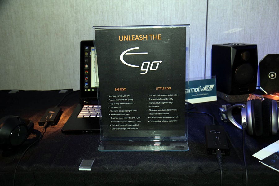There was a small table in the Emotiva room with both the Big Ego and Little Ego DACs on display attached to laptops and headphones. The front of the two devices looks the same but the Big Ego is slightly larger. The Big Ego also has a switch to select from the three available outputs while the Little Ego does not need one as it has only a single headphone output. The enclosures felt like aluminum with LED indicators that display the frequency rate and the filter in use. It was very difficult to judge sound quality as the room was quite loud with several demonstrations occurring at the same time. The Ego Trip and the Ego Maniac were not on display but were mentioned by Emotiva employees.