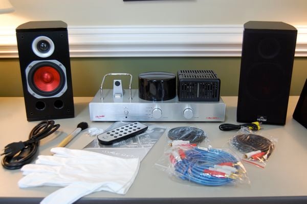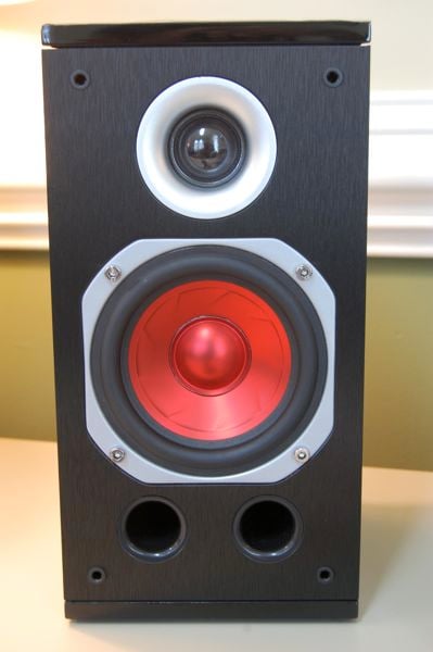 Also included are a pair of nice bookshelf speakers. The speakers have 1" dome tweeters and metallic red 4" woofers. There are twin ports on the front under each woofer. The woofer and tweeter are surrounded with silver borders on black faceplates. The top and bottom of each speaker have a high-gloss black cap, which add to the heft and good looks of the system. Suffice it to say, you will not be needing the included black cloth grills. Just like the tubes, the speakers look better naked! (But then again, doesn't everything? Wait, as I think about that - nevermind.)