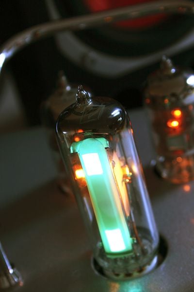 The amplifier pumps out 25 watts per channel, and one thing I noticed right away was that the louder the system plays, the better it sounds. I first noticed that the fluorescent meter did not pulse much at all - there was only the slightest hint of movement - until I really cranked up the volume. Then it danced with the beat of the music, adding yet another visual treat to the already vibey orange glow of the tubes behind it. As you increase the volume, so increases the "throat" of the music, revealing more and more detail as well as punchy warm bass. This characteristic made it hard to do any critical listening during the day, as I am in an office full of people during business hours and my neighbors would not be happy were I to begin to fill the building with all that tube amp goodness. But after 5PM, I would let it open up and was thrilled with the sonic results.