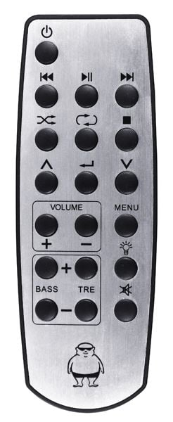 Also included is a full featured remote control, that can operate many (docked) iPod features, including Play/Pause, Power Off, Skip/FFW, REW, etc. Also on the remote are separate Bass and Treble volumes - more on that later. The huge missing item on the remote is the ability to select different input sources.