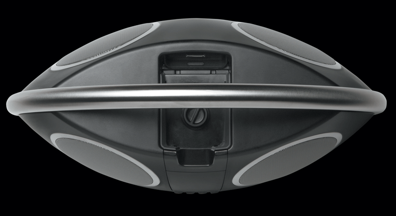 Your iPhone or iPod docks into the top of the unit and is angled slightly so that you can see the screen. There's a twisting knob in the middle that you can tell Harman desperately wants you to think actually does something... but it doesn't. Now, operating the Go + Play II is simple if you're using a playlist. What Harman Kardon did for the remote was to use an RF-based solution with just 6 buttons. It's kinda pretty, and way cool in that you don't have to point it, and it even stores inside the unit itself. But it's difficult to figure out. There's a Music mode, when its LED flashes Blue. Here you can operate the Music controls: volume, track skipping, fast-forward/rewind, play and pause... Hit the lower left Mode button and an Orange LED lets you know you can now control your actual iPod, navigating the menu and scrolling through playlists, songs or artists. Harman tries to help, by giving you some stickers to label the remote if you have trouble keeping up. And you will. It's definitely a case of form over function, and it is a bit confusing.