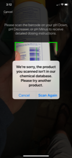 The chart above shows pH levels in the pool over the course of a week. I decided to add pH down to get my levels down around 7.5 and this is where the pHin really shows it’s worth. The app instructed me to scan the product I normally would use to bring my pH down to the proper level. I scanned the UPC of my bottle of Leslie’s Dry Acid. Unfortunately, I received a message stating that the product I scanned wasn’t in their database and to please try another product.