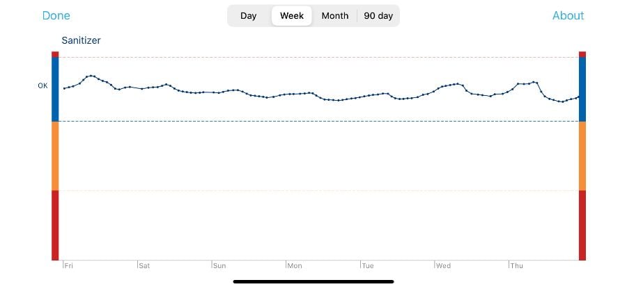 The chart above shows the sanitizer levels in the pool. You can see that you don’t get a number, but a graph of the change in sanitizer levels throughout the day or week.