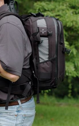 While the backpack system is very heavy duty and comfortable when it is on your back, the padded waist belt system adds to the amount of space the back pack takes up. The straps and waist belt are sewn on, and are not removable. During my trip, I often times found myself trying to configure the straps and belt system in a manner that would take up the least amount of room. It would be very helpful if some system (possibly as simple as adding some strategically placed velcro) were added to help keep this cumbersome system at bay when not doing duty protecting your back.