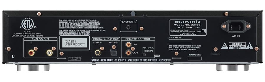 Taking a look at the back of the Marantz CD6004 we see just about everything you'll need for a CD transport. While it is almost jarring not to see an HDMI output, it really isn't needed with only a CD on board. You will find stereo RCA outputs plus one optical and one coaxial digital audio output. There is a Remote Control in and out with a External/Internal switch (not sure what that is about yet) and a Flasher In. It isn't exactly clear what the "Flasher" is though it sounds like it would work with a universal remote system (we'd check the manual to find out but Marantz doesn't have it up on their site yet).