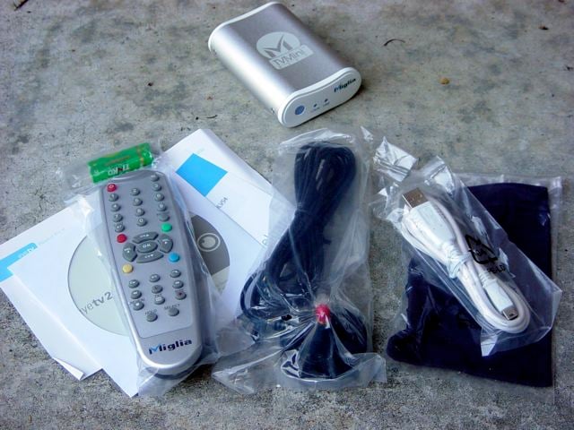 inthebox.jpgIn the small box you will find the TVMini HD HDTV USB 2.0 Device, which is a small, brushed aluminum curvy box about the size of a pack of cigarettes, a CD-ROM with the Eye TV software and PDF guide, a remote control with 2 AAA batteries, a portable TV antenna, a slick little microfiber carry bag for the device, and a white USB 2.0 cable. The device weighs about 4.5 oz, and is aluminum with white plastic finish.