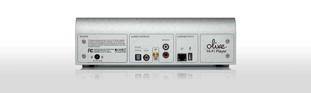 The Olive O2M has everything we've come to expect from an Olive product. it supports not only MP3 (128 and 320 kbit/s) but also WAV, FLAC, and AAC (128 kbit/s). The O2M supports 16, 20, and 24 bitrates along with sampling frequencies from 10kHz up to 96kHz. It is networked (obviously) and can connect via a wired Gigabit Ethernet connection or a built in 802.11g wireless connection. There is a single 1.1/2.0 USB port on the back along with a set of stereo RCA outputs and both optical and coaxial digital outputs.