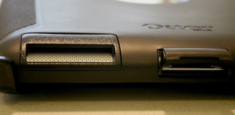 There are a few unprotected openings which make the cover essentially non-weatherproof, the largest of which is over the speaker grill. Some means of sealing the iPad from dust and water would be useful, though understandably this was not the intent in the OtterBox case design.