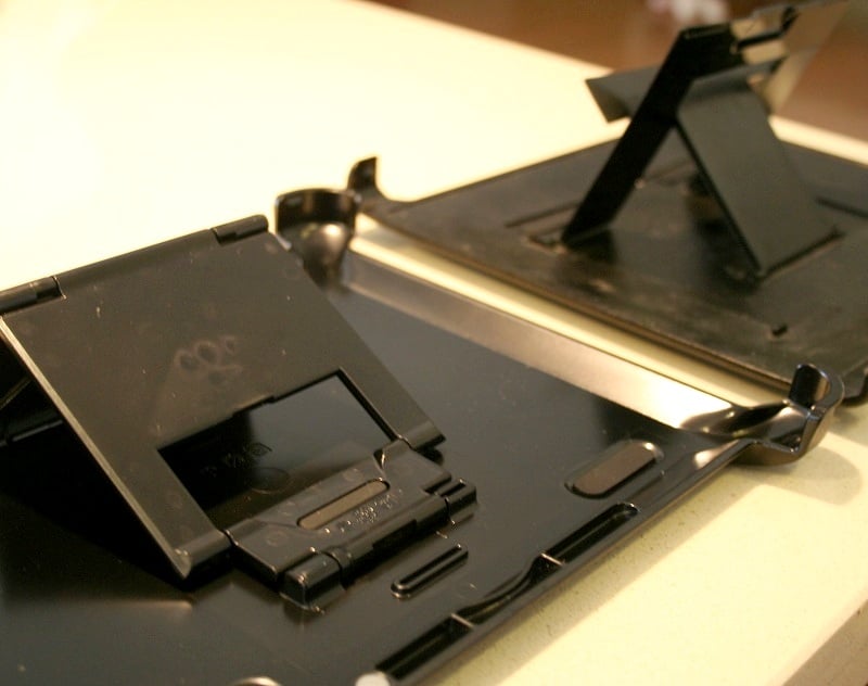 The last piece of the case is the front cover/stand. Where the original iPad case snapped on around the sides, this one does so from the corners. The cover (and case overall) has a glossier look than the original OtterBox offering though that may be just from age. The case has an integrated stand which can hold the iPad in either landscape or portrait orientation (the original could only do landscape).
